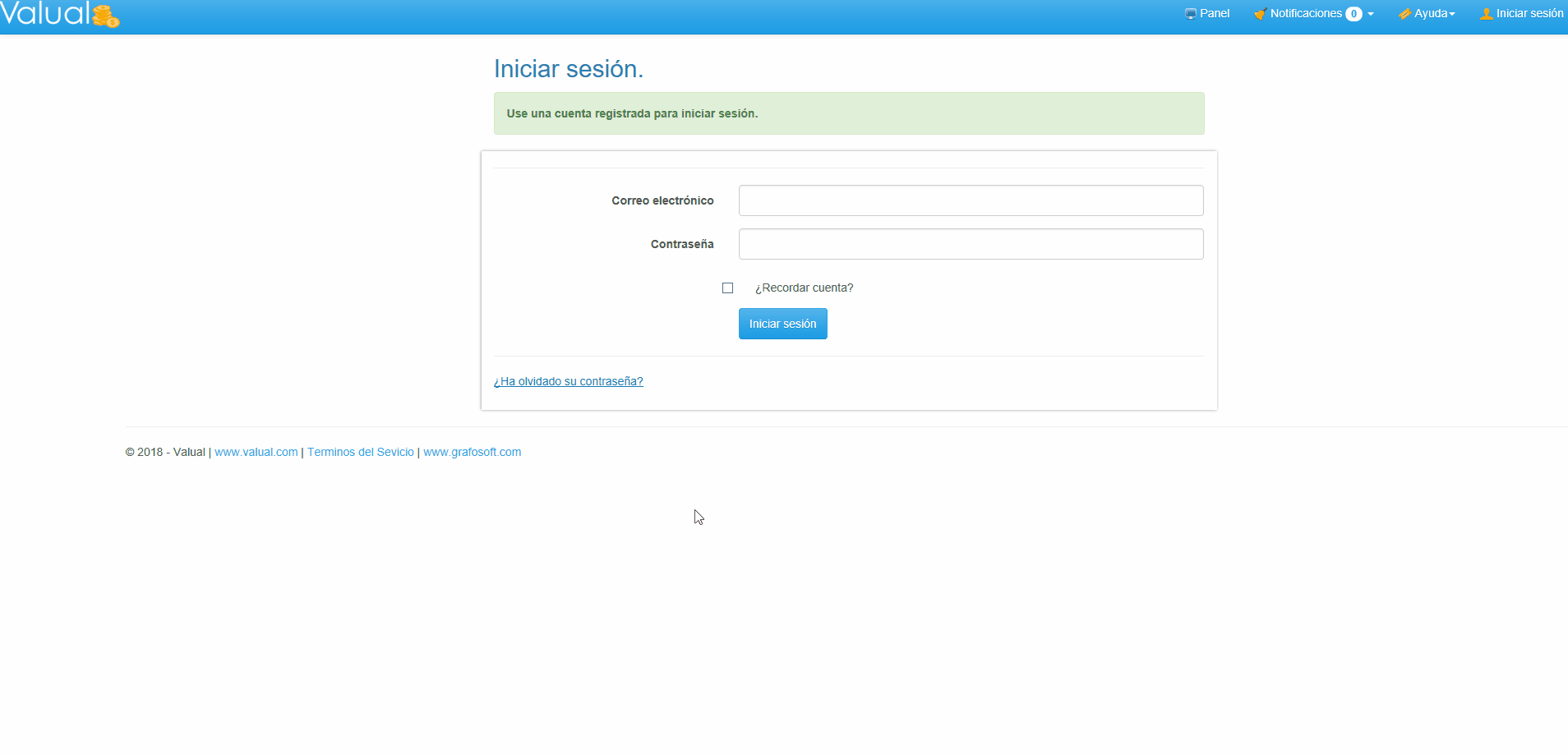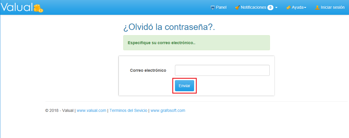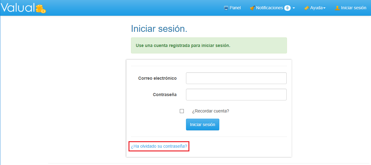 1. Ingresa al Panel Iniciar Sesión en Valual. 2. Selecciona la opción ¿Ha Olvidado su Contraseña?