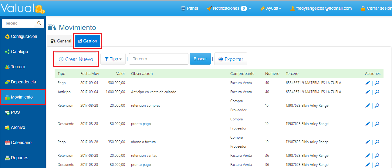 1. Ingresa a Movimiento en el Menú Principal, selecciona Gestión y haz clic en Crear Nuevo.