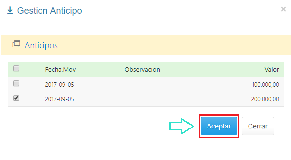 3. Selecciona los Anticipos que desees asociar a tu Factura y haz clic en Aceptar.