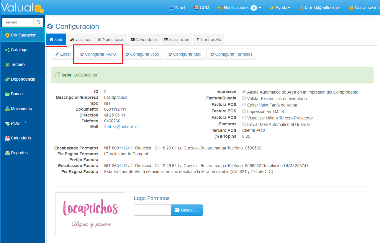 1. Selecciona Configuración en el Menú Principal. 2. En la seccion Sede, haz clic la opción Configurar PAYU.