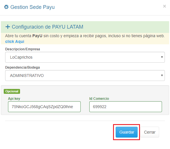3. Realiza la consulta de Apy Key e Id de Comercio como lo explicamos al inicio del proceso, Copia estos datos y pegalos en los respectivos campos. 4. Haz clic en el botón Guardar.