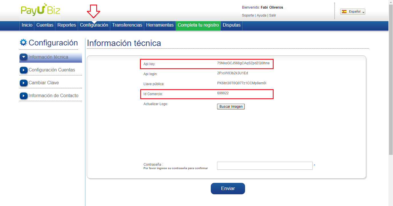 Consultar Api Key e Id de comercio 1. Ingresa a tu Cuenta Payu, creada previamente. 2. Haz clic en Configuración, donde encontraras el Api Key y el Id de Comercio.