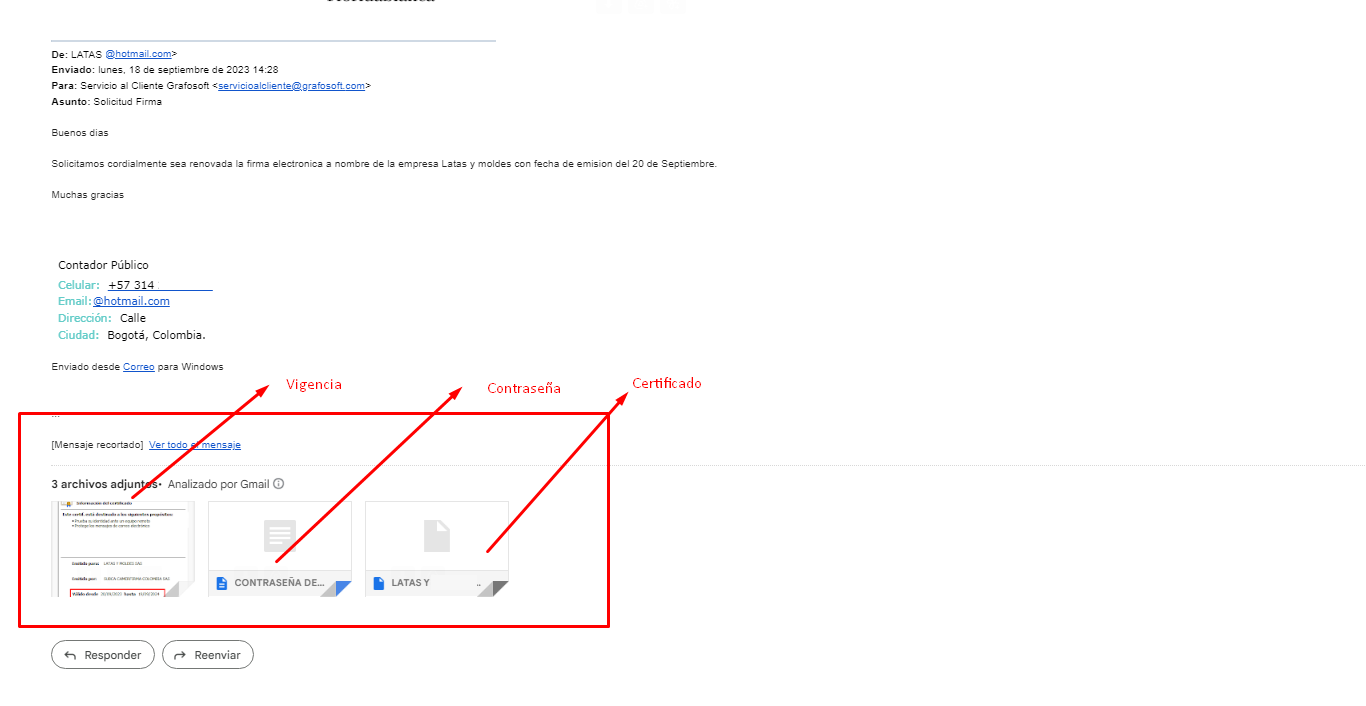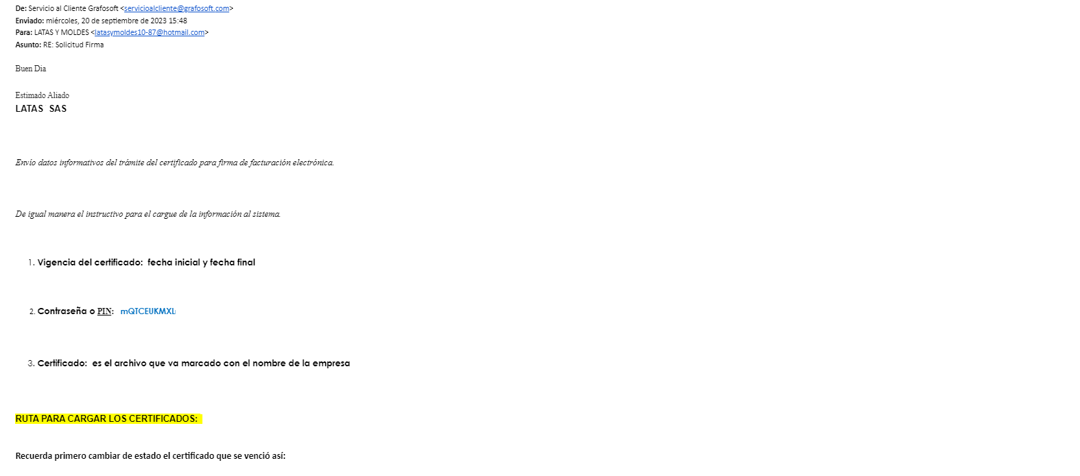 3. Al final del correo encontrarás tres archivos, Fechas de vigencia, contraseña y el certificado de firma digital listo para descargar y configurar.