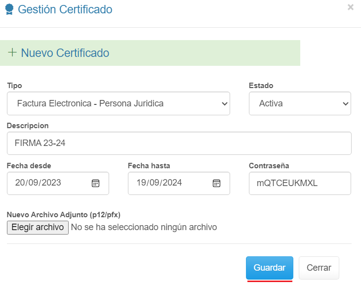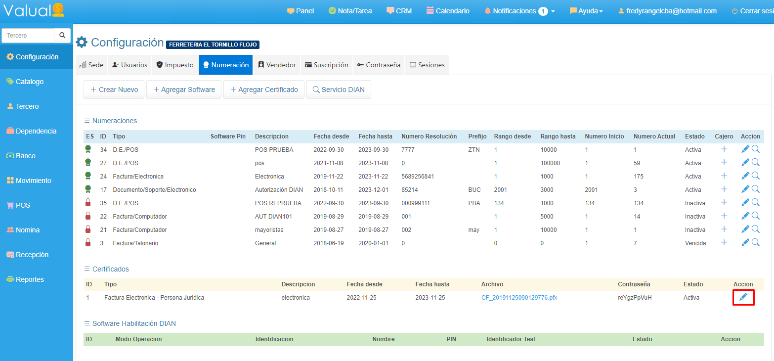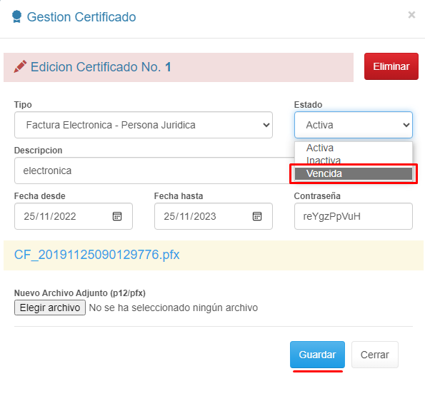 5. Finaliza verificando datos y desactivando el Certificado vencido haciendo clic en el botón en forma de Lápiz al final del registro.
