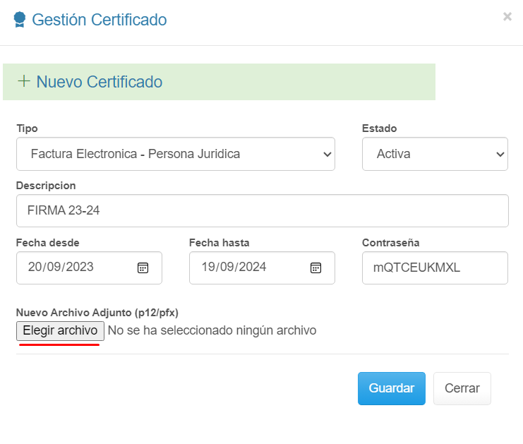 2. Agrega un descripción libre como nombre de la firma, datos de la vigencia y contraseña (información adjunta en el correo). 3. Has clic en el botón Elegir archivo.