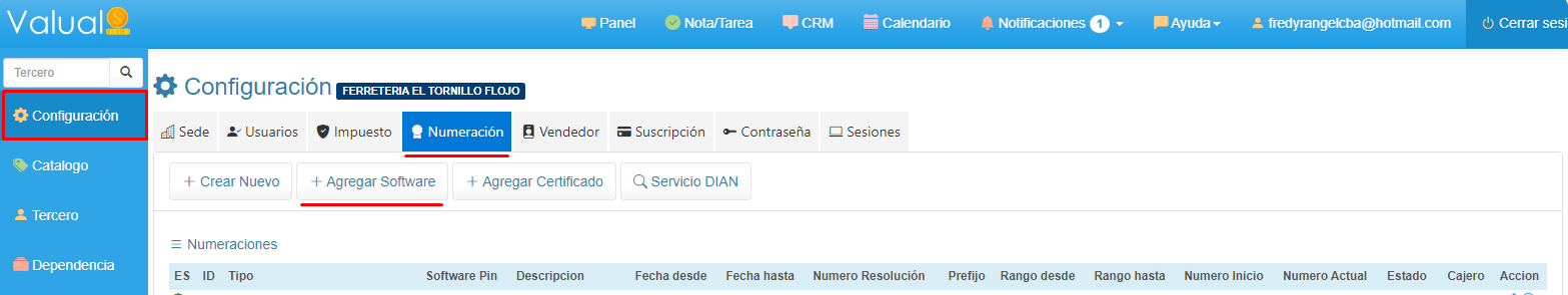 1. Ingresa a Menú Configuración, selecciona la opción Numeración y haz clic en el botón + Agregar Certificado.