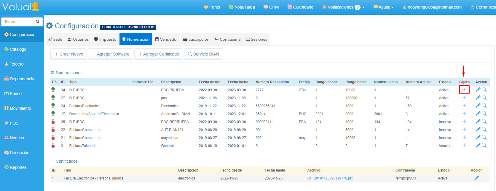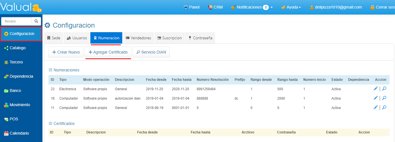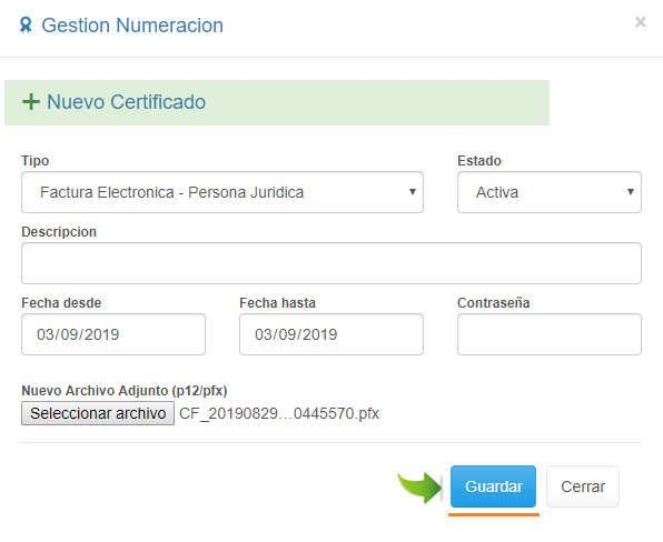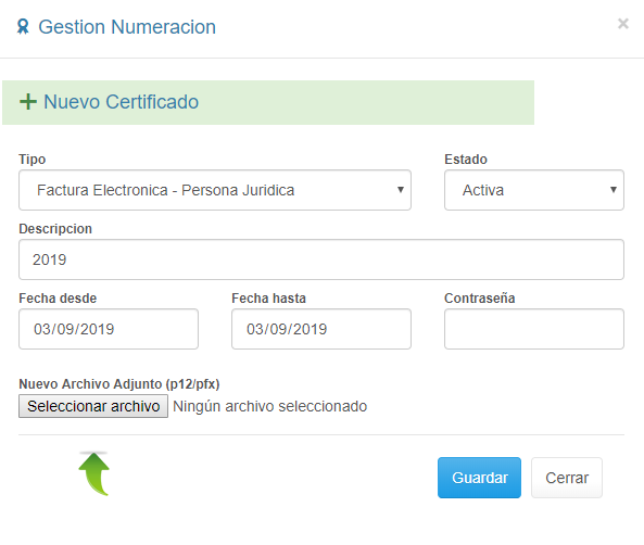 1. Selecciona Configuración en el menú Principal. 2. Ingresa a la pestaña Numeración y haz clic en el botón + Agregar Certificado.