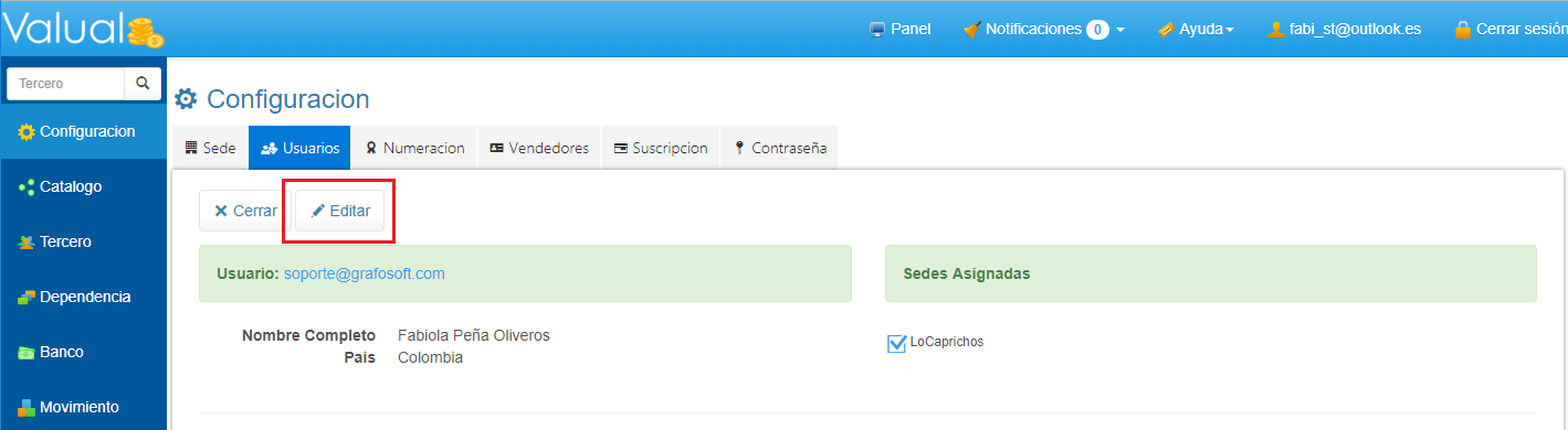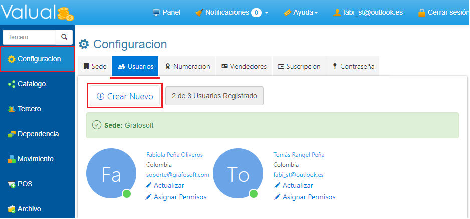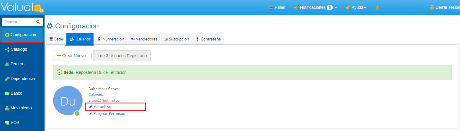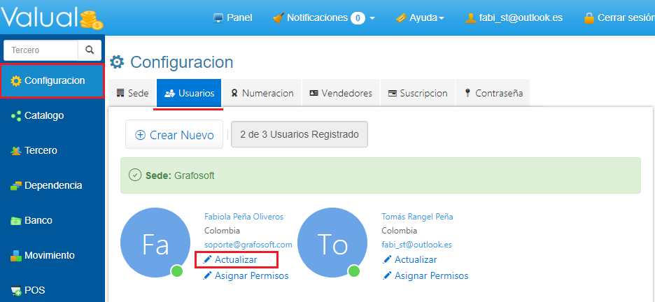 1. Ingresa a Configuración en el Panel Principal de Valual y selecciona Usuarios. 2. Haz clic en la opción Actualizar que se visualiza en la parte inferior del registro de cada Usuario.