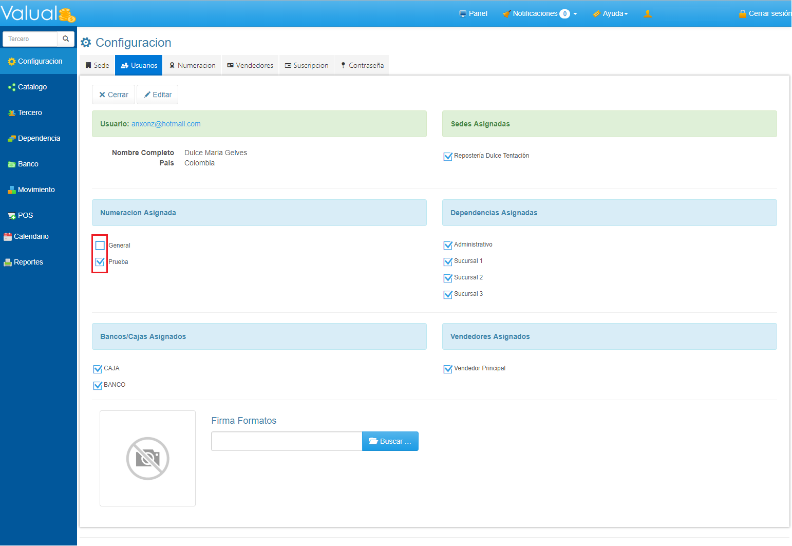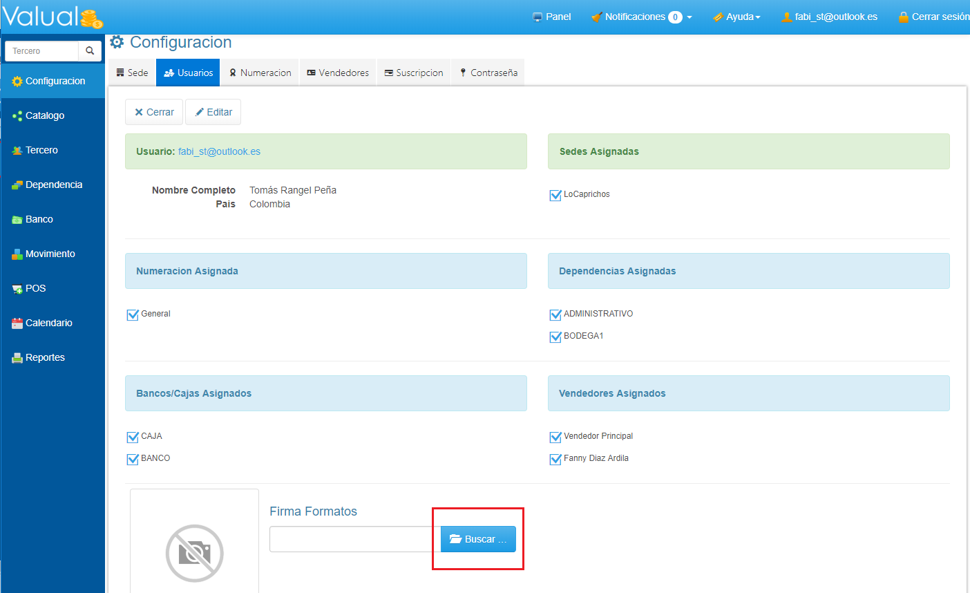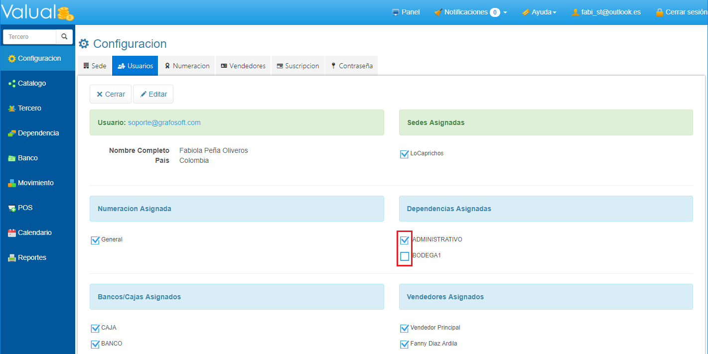 1. Ingresa a Configuración en el Panel Principal de Valual. 2. Selecciona Usuarios. 3. Haz clic en el botón Actualizar. 4. Selecciona las Dependencias y/o Bodegas que deseas asignar según el Perfil del Usuario