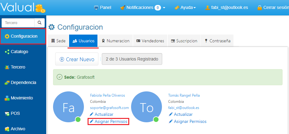 1. Ingresa a Configuración en el Panel Principal de Valual. 2. Haz clic en la opción Asignar Permisos que se visualiza en la parte inferior del registro de cada Usuario.