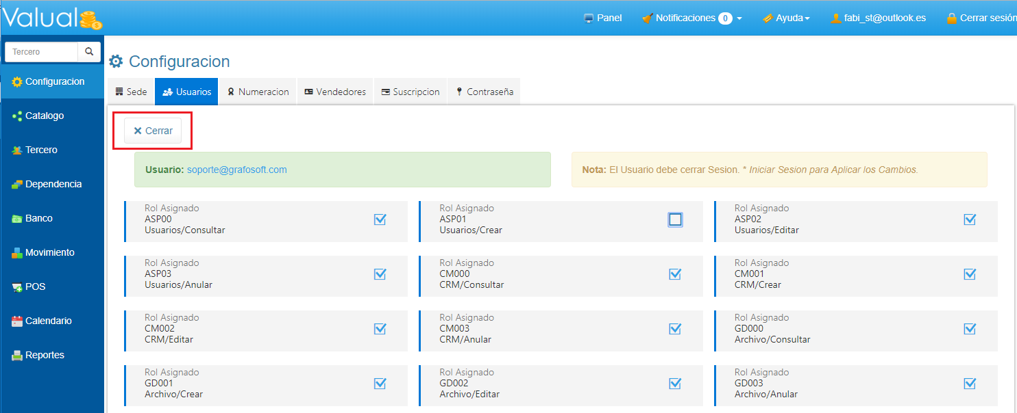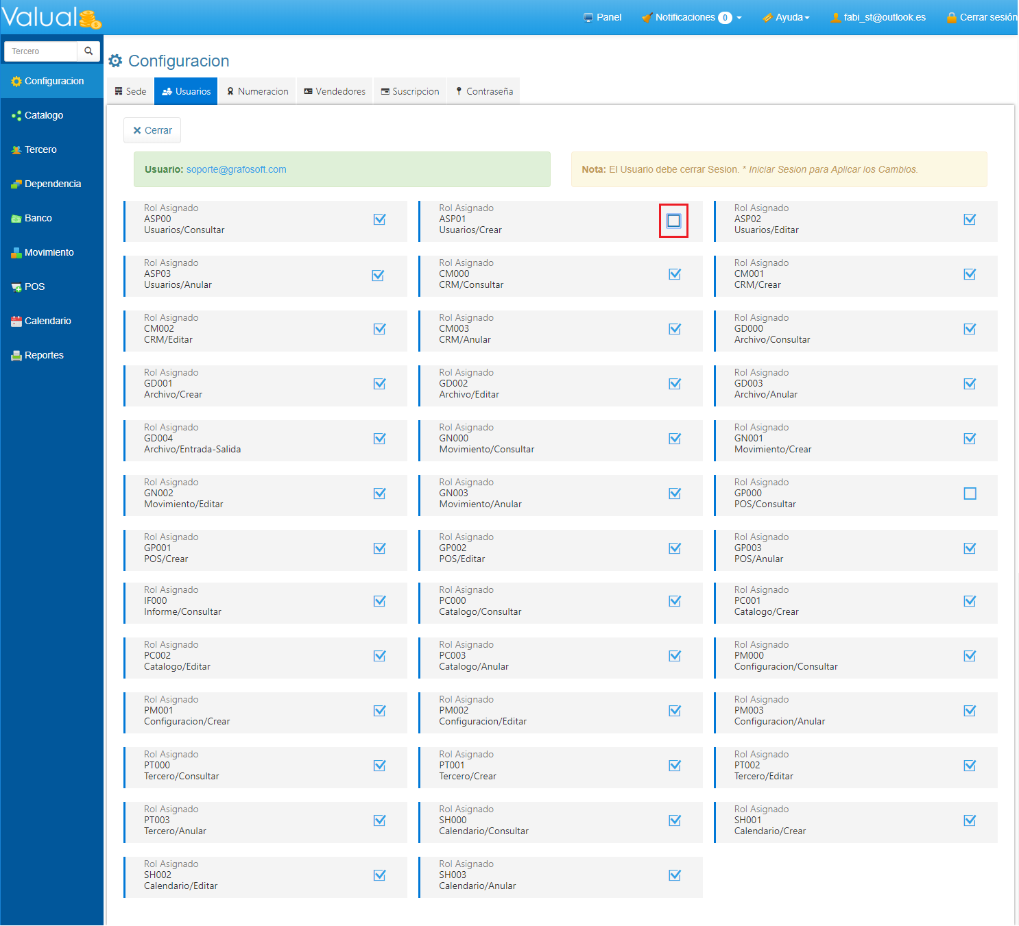 3. Todos los permisos aparecen asignados por defecto, haz clic en la casilla de verificación correspondiente, para quitar los permisos que desees según el rol de Usuario.