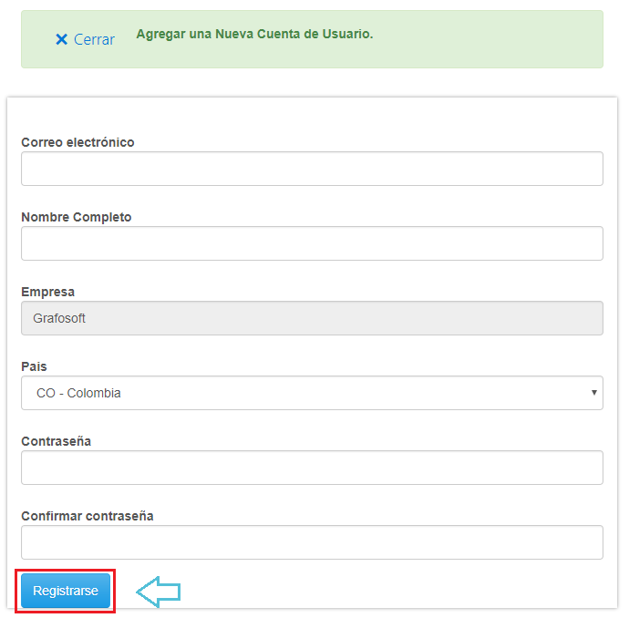 2. Diligencia los campos requeridos del Formato que se muestra para hacer el Registro de Nuevos Usuarios. Para finalizar pulsa el botón Registrarse.