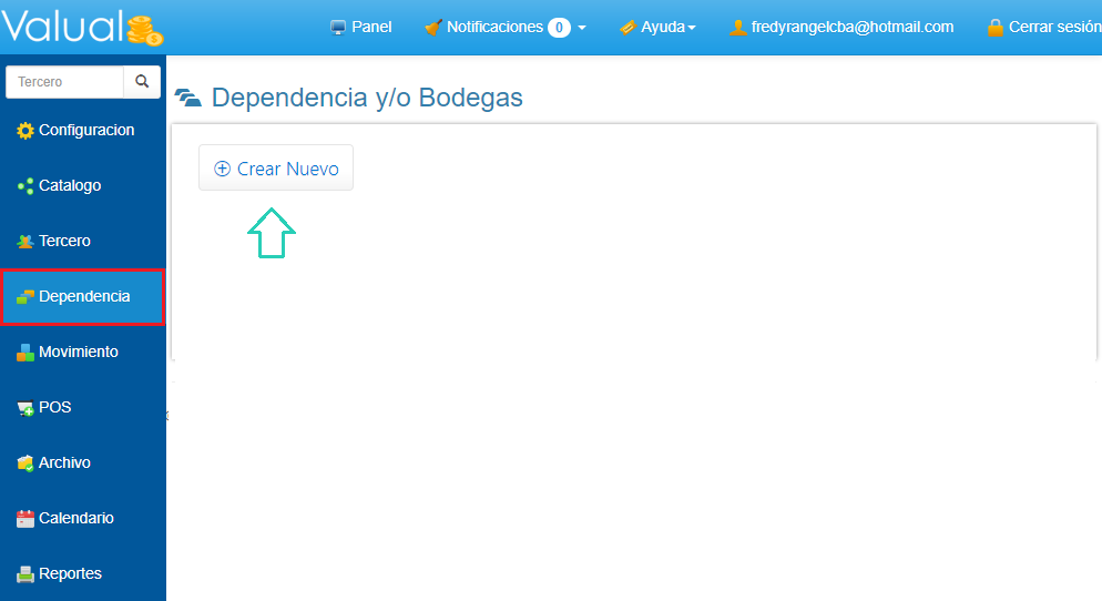 1. Selecciona Dependencia en el Menú Principal de Valual y Haz clic en el botón Crear Nuevo.