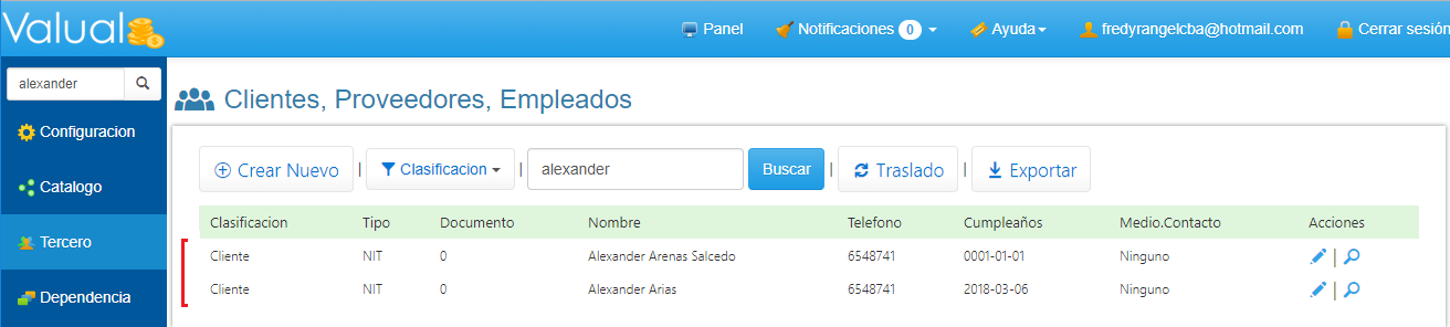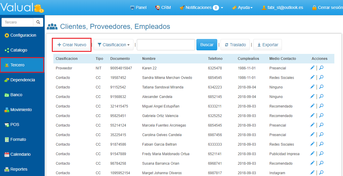 1. Selecciona Tercero en el Menú Principal de Valual y haz clic en el botón Crear Nuevo.