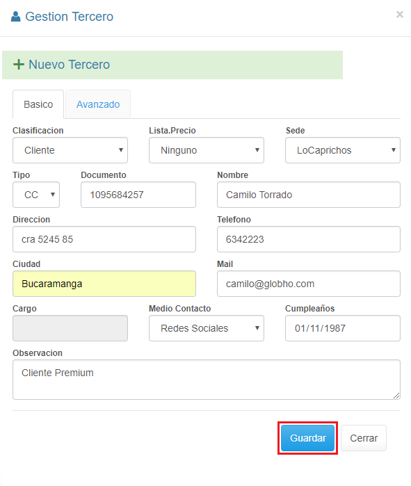 2. Diligencia el Formulario de Gestión Tercero en la sección Basico.