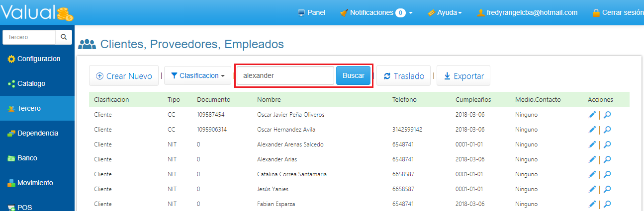 El sistema visualizará los Terceros relacionados con la descripción digitada en el campo de Búsqueda.