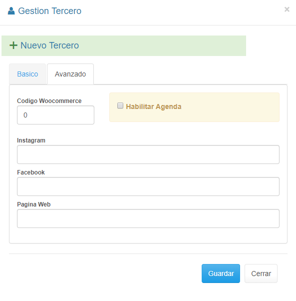 3. Para agregar datos avanzados del Tercero, como Código Woo commerce, instagram, facebook ó Pagina Web, puedes hacer uso de la pestaña Avanzado. nota: esta sección es Opcional, además puedes configurar el tercero para agendar alguna actividad creada en el Catálogo, seleccionando la casilla de verificación 5. finaliza el registro haciendo clic en el botón Guardar.