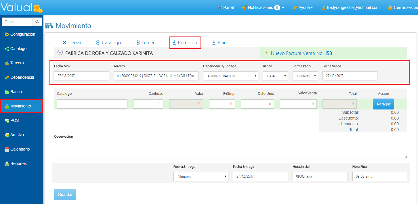 4. Ingresa los datos iniciales requeridos en el formulario para crear la factura y haz clic en en la opción Remisión.
