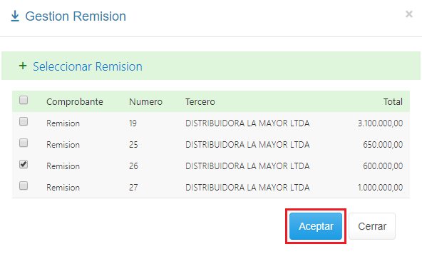 5. Selecciona la Remisión que deseas asociar a la Factura y haz clic en el botón Aceptar.