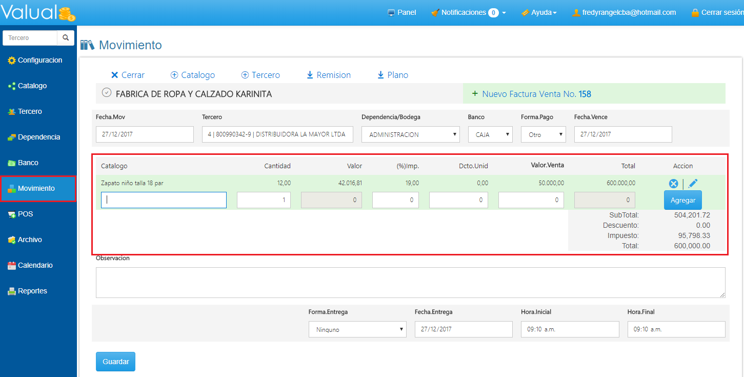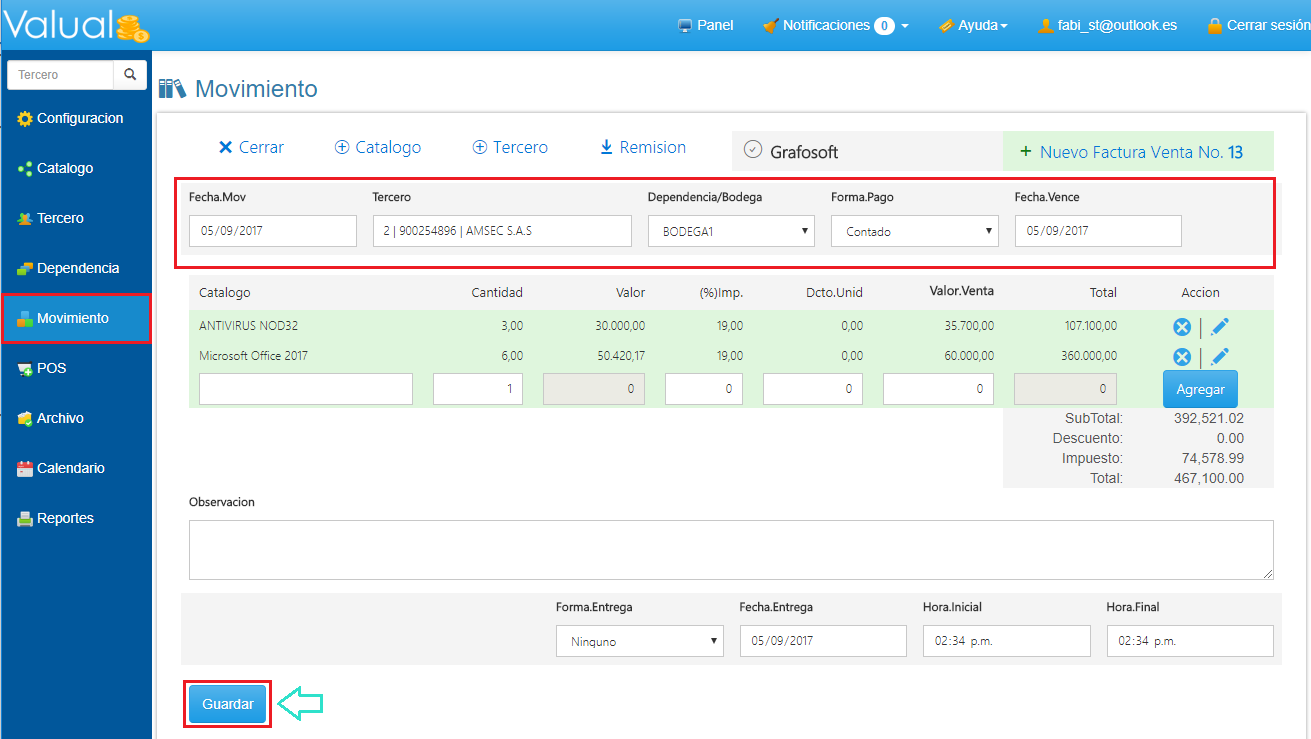 6. Diligencia los datos de la Factura como Tercero, Forma de Pago, Dependencia, etc. Para finalizar haz clic en Guardar.