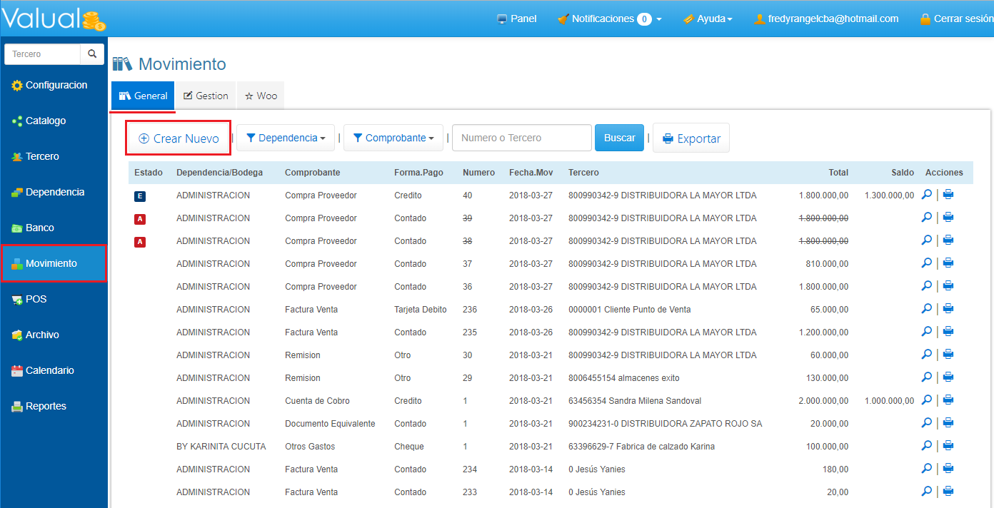 1. Ingresa al Movimiento en el Menú Principal. 2. En la sección General, haz clic en el botón Crear Nuevo.