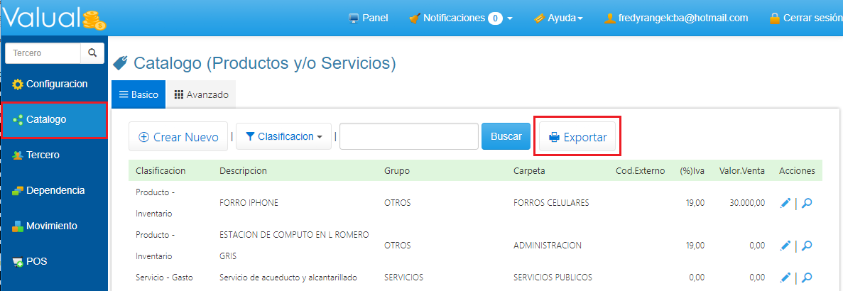 1. Ingresa al Catálogo en el Menú Principal de Valual. 2. Selecciona la opción Exportar.