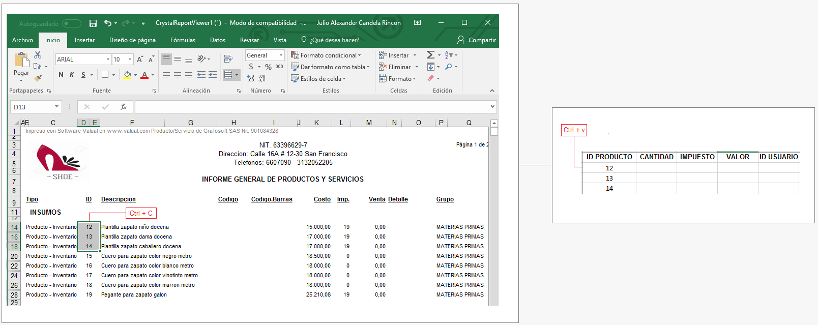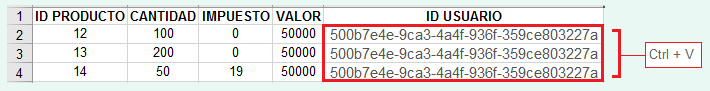 3. Ingresa al archivo Excel previamente descargado en el paso nùmero 1 y copia el ID PRODUCTO y pégalo en el formato que se describe en el numeral anterior. 4. Diligencia los demás campos requeridos en el formato Excel para generar Archivo Plano.