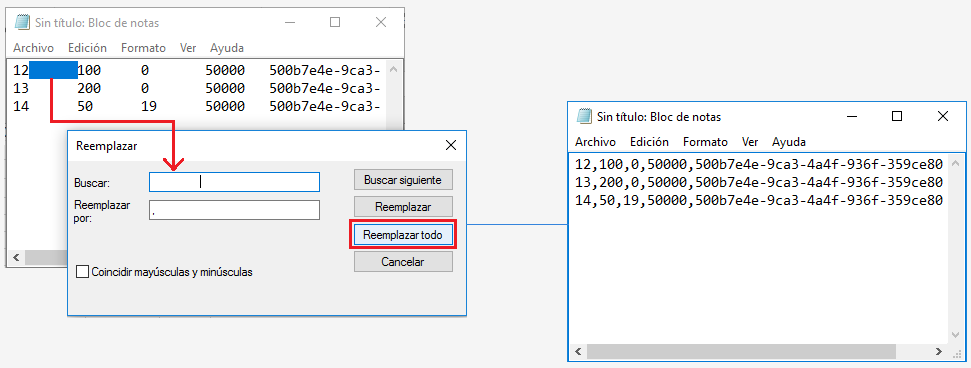 6. Elimina los espacios entre datos y reemplazalos por comas (,).