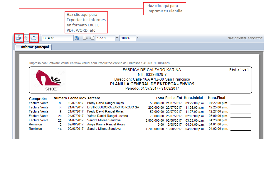 Una vez tengas lista tu Planilla de Entrega, la puedes Exportar a Excel ó Imprimr. |