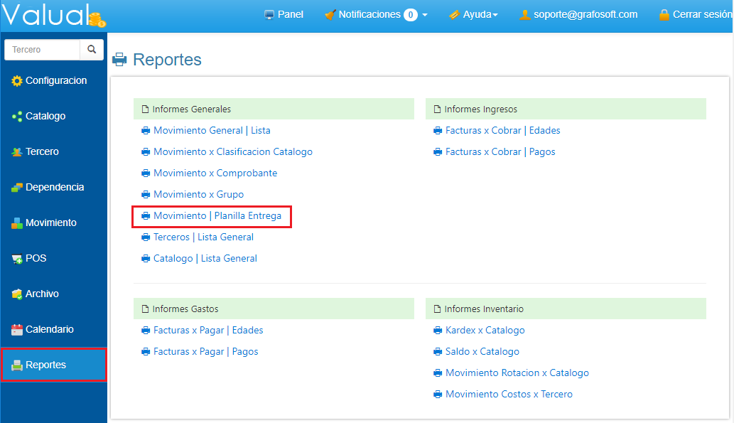 1. Selecciona Reportes en el Menú Principal. 2. Haz clic en Informe Movimiento Planilla de Entrega.