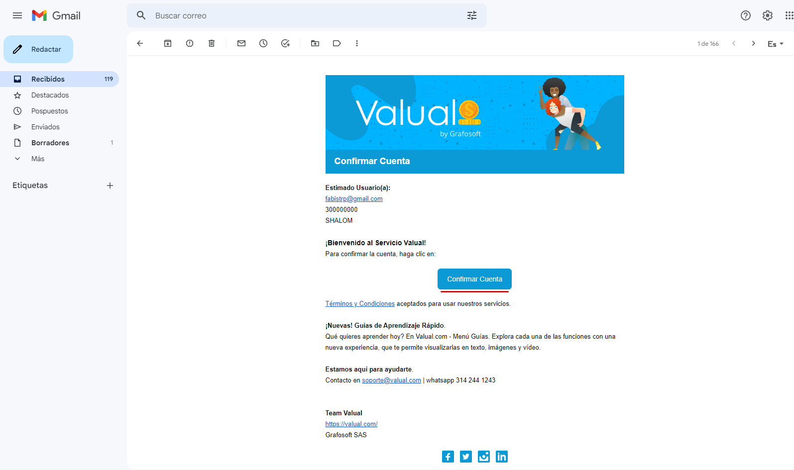4. Al finalizar el proceso anterior, dirígete a la bandeja del Correo Electrónico Registrado y accede a un Mensaje de la Plataforma Valual que contiene un Enlace de Confirmación, haz clic en el Enlace para finalizar el registro.