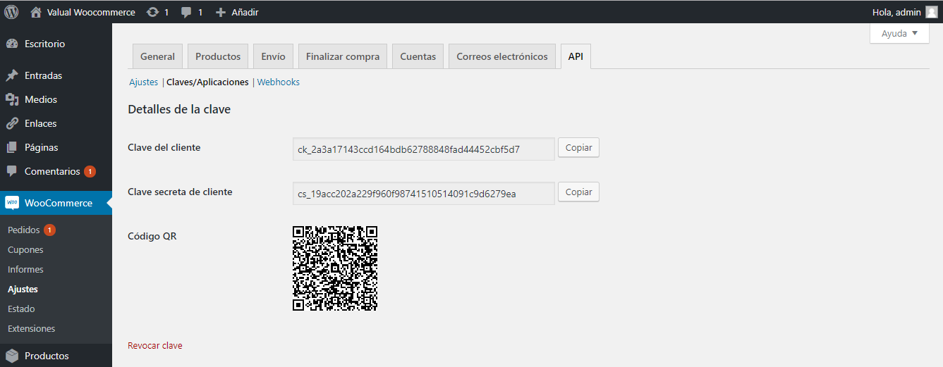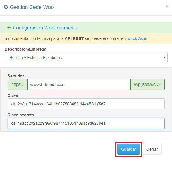 6. Ingresa a Valual, sigue la ruta Movimientos-woo, haz clic en el botón Configurar WooCommerce, en el campo servidor, registra tu Dominio (ejemplo: www.tutienda.com), pega en los campos respectivos las Claves que se generaron en el punto anterior. 7. Para finalizar, haz clic en Guardar.