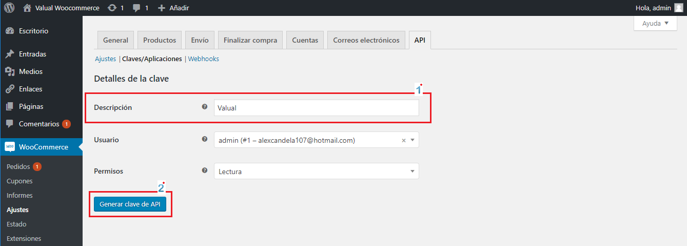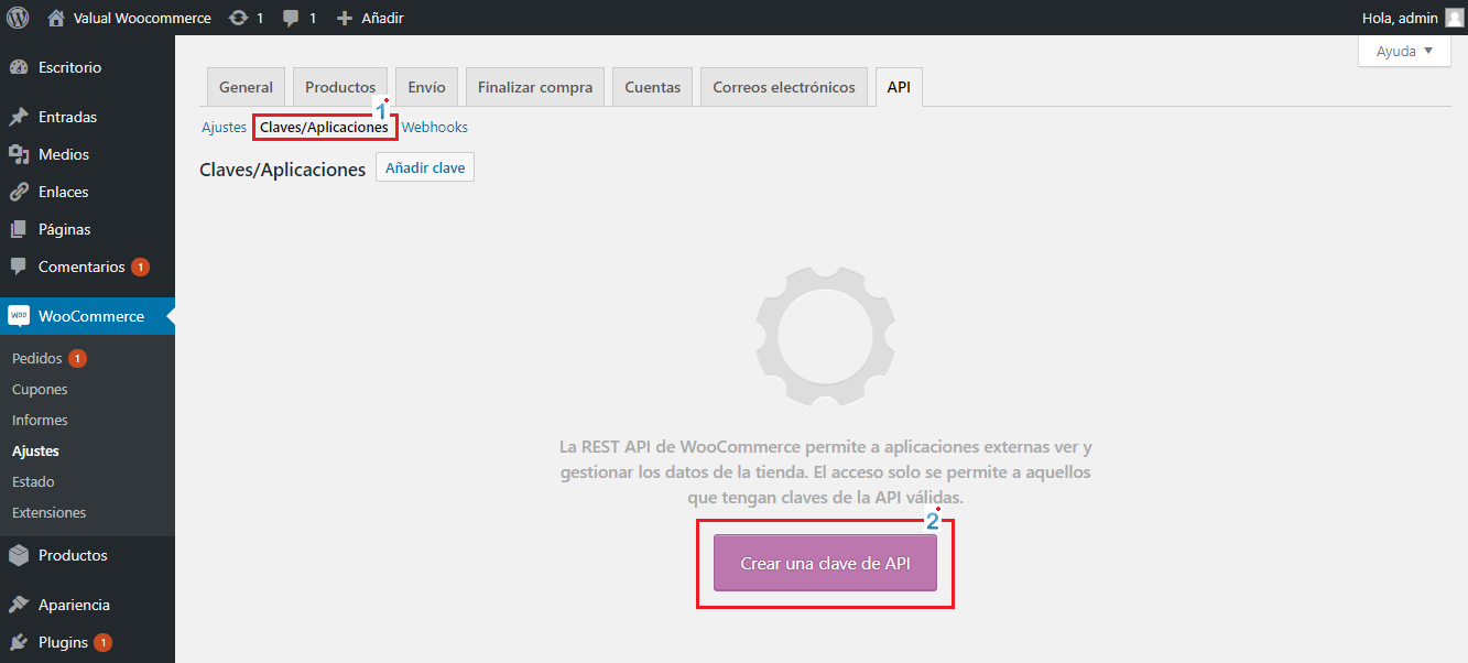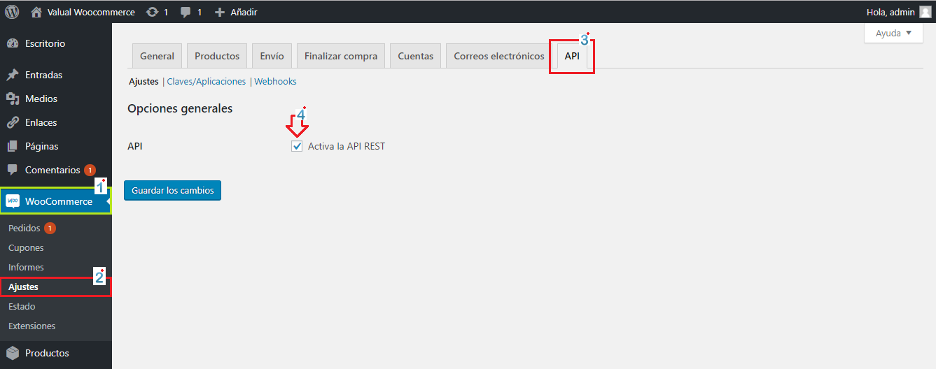 1. Inicia sesión en WooCommerce. 2. Sigue la ruta WooCommerce.-Ajustes-API y verifica que la casilla correspondiente a Activa la API REST, este seleccionada.