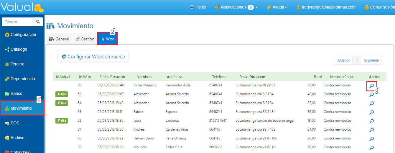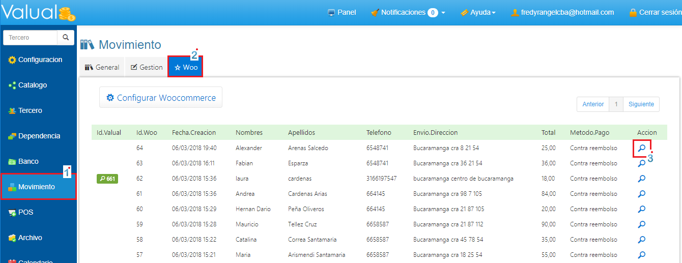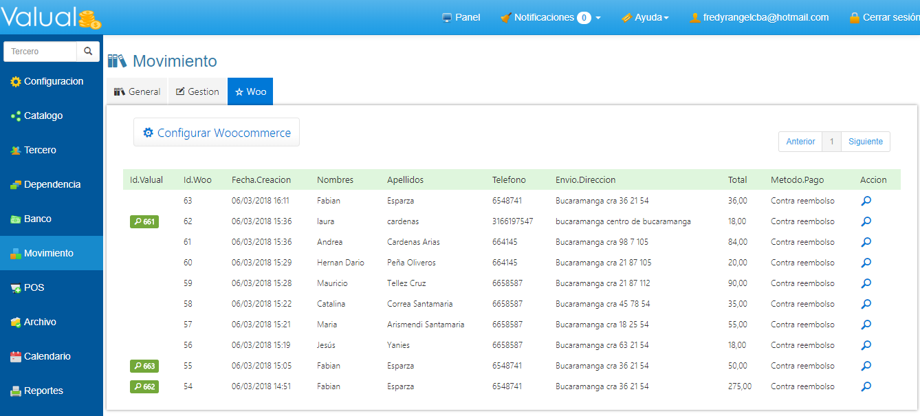 Al finalizar la configuración de tu Woocommerce en Valual, puedes visualizar tanto las Ordenes de Pedidos ya generadas en tu Tienda Woocommerce, como las nuevas ordenes en Tiempo Real.