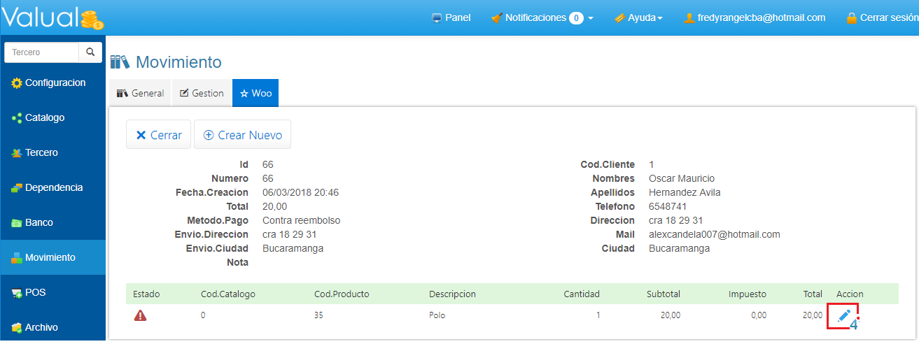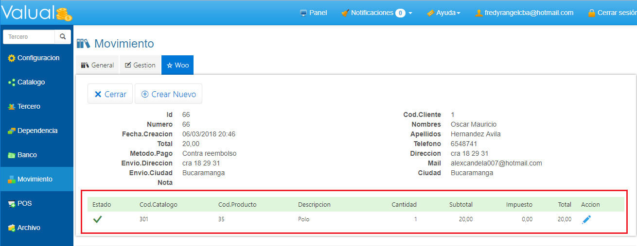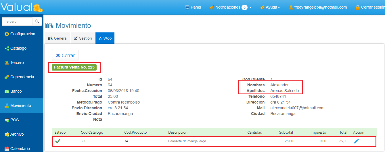 Este caso presenta un ejemplo con una Orden de Pedido realizada en Woocomerce, en esta orden consta la solicitud de un Producto por un Tercero que no se encuentran creado en Valual, a continuación te enseñamos los pasos que debes realizar para que el Producto y el Tercero se cree automáticamente. |