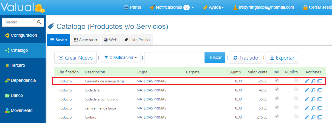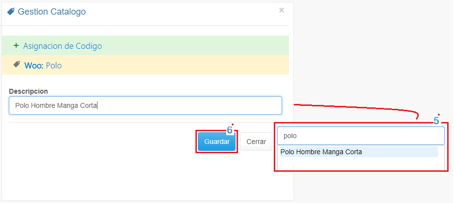 3. En el campo Descripción realiza la búsqueda del Producto previamente creado en el catálogo de Valual, seleccionálo y haz clic en el botón Guardar.