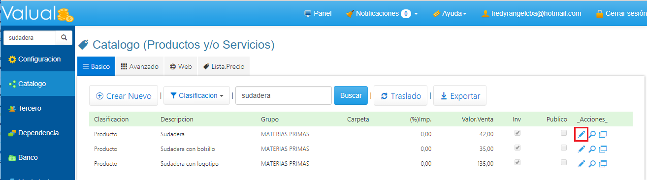 1. Haz clic en Catálogo en el menú principal. 2. Realiza la búsqueda del Producto que deseas consultar. Ver aquí 3. Haz clic en el icono en forma de Lápiz.
