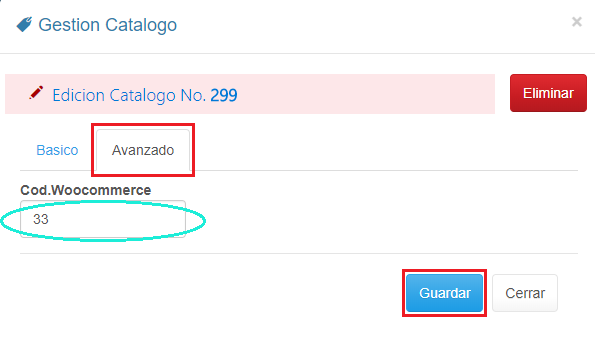 4. En el Detalle del Producto, haz clic en la pestaña Avanzado, ahí se visualiza el Código Woocommerce, con el que se encuentra relacionado el Producto creado en tu Catálogo Valual.