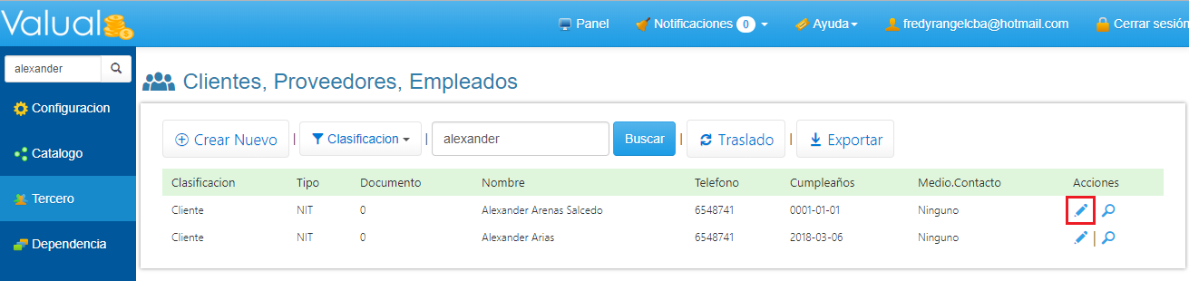 1. Haz clic en Tercero en el menú principal. 2. Realiza la búsqueda del Tercero que deseas consultar. Ver aquí 3. Haz clic en el icono en forma de Lápiz.