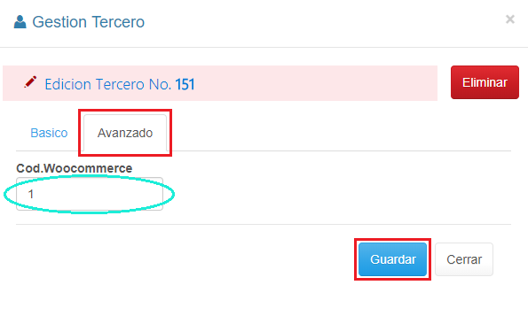 4. En el Detalle del Tercero, haz clic en la pestaña Avanzado, ahí se visualiza el Código WooCommerce, con el que se encuentra relacionado el Tercero creado en la sección Tercero de Valual.